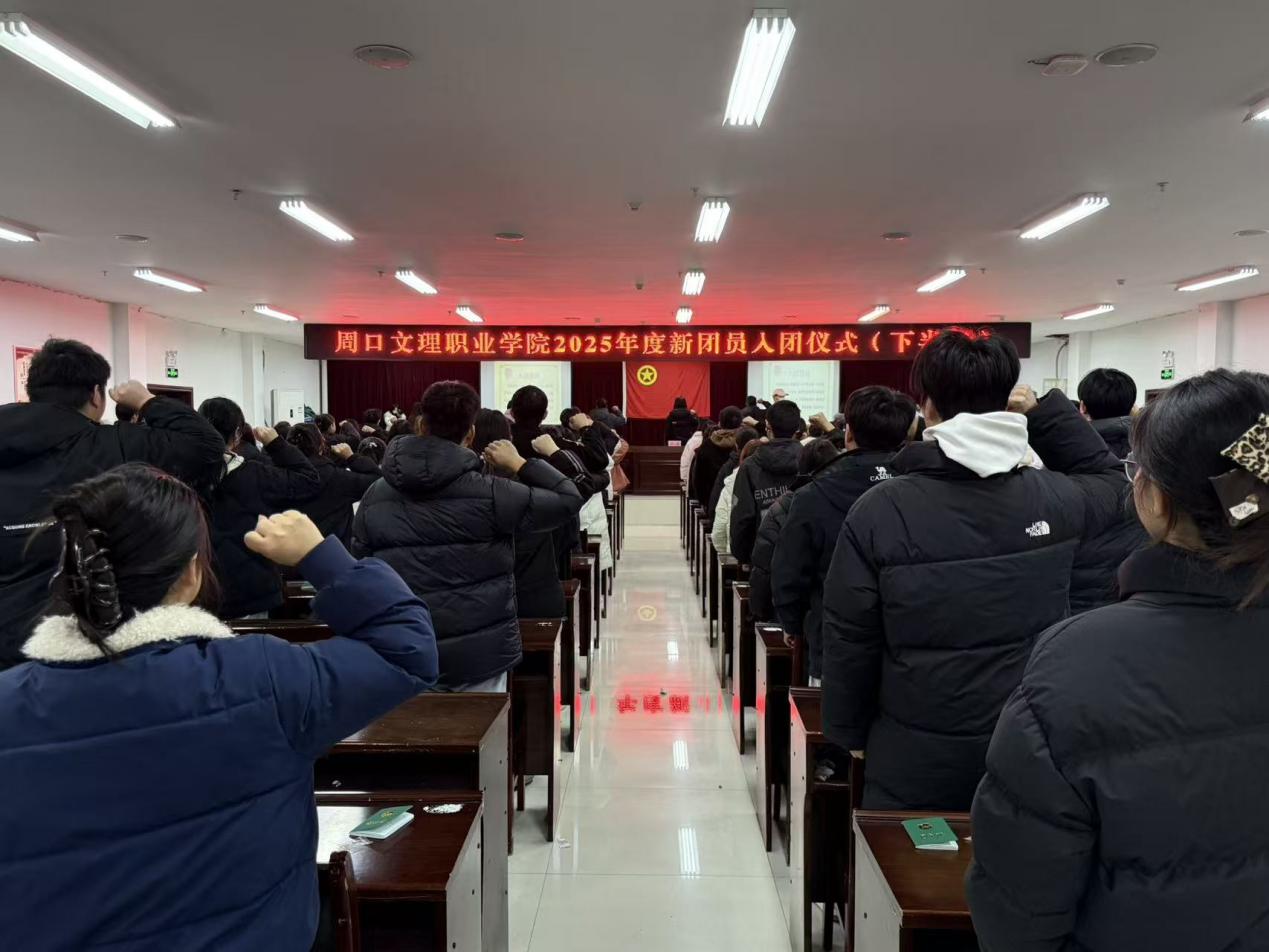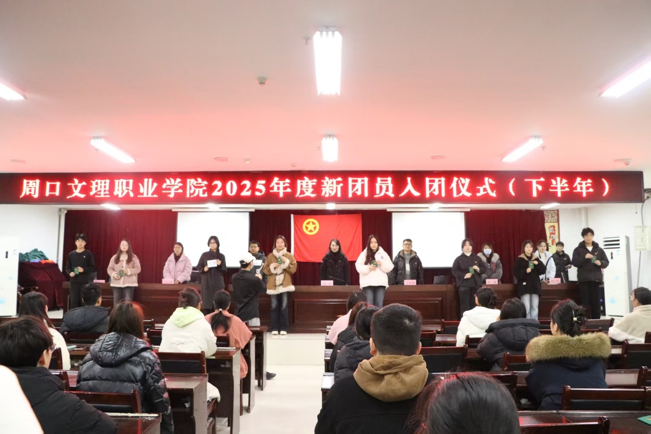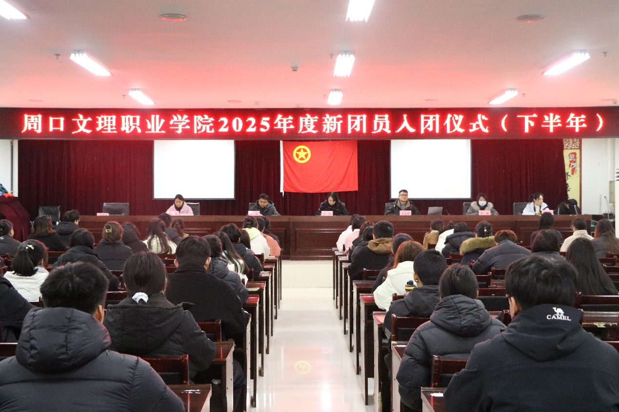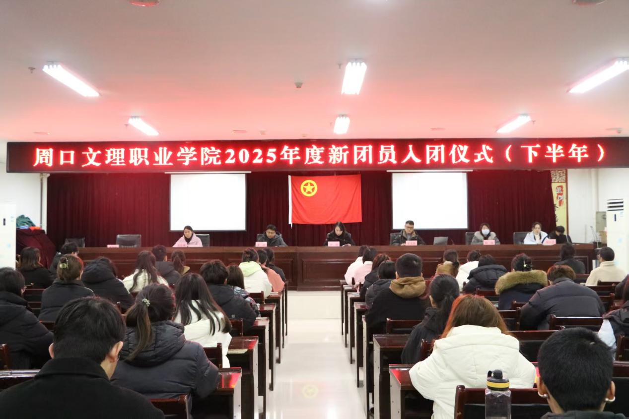 2025年12月24日上午,周口文理职业学院在会议室举行了2025年下半年新团员入团仪式。学校相关部门负责人、二级学院团总支书记、112名新团员和老团员代表齐聚一堂,共同见证这一光荣时刻。