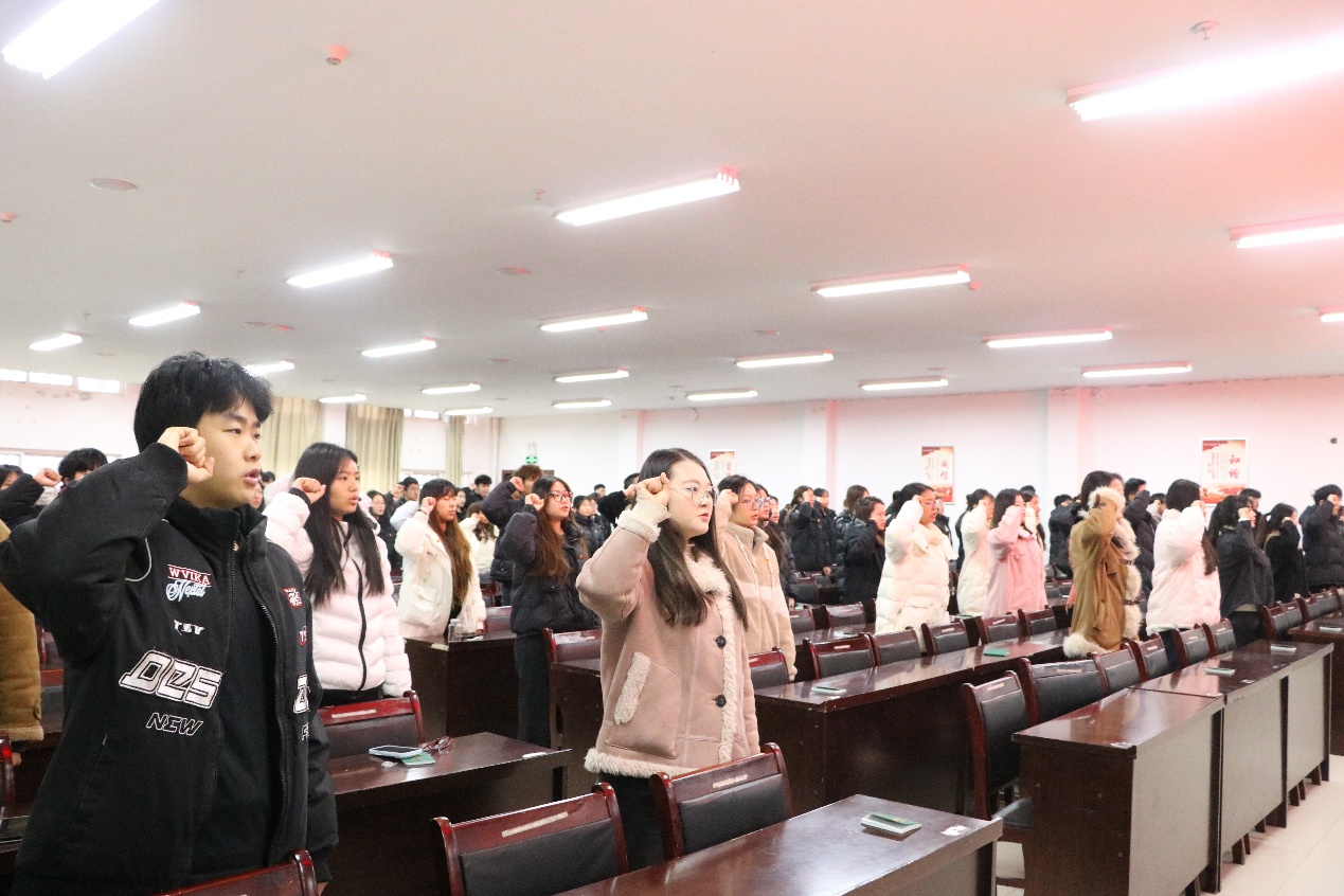 在领誓人王媛媛同学的带领下,全体新团员面向团旗,高举右拳,庄严宣誓,铿锵有力的誓言展现了新时代青年的坚定信念与使命担当。