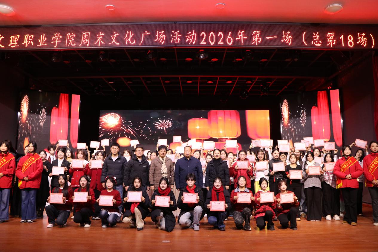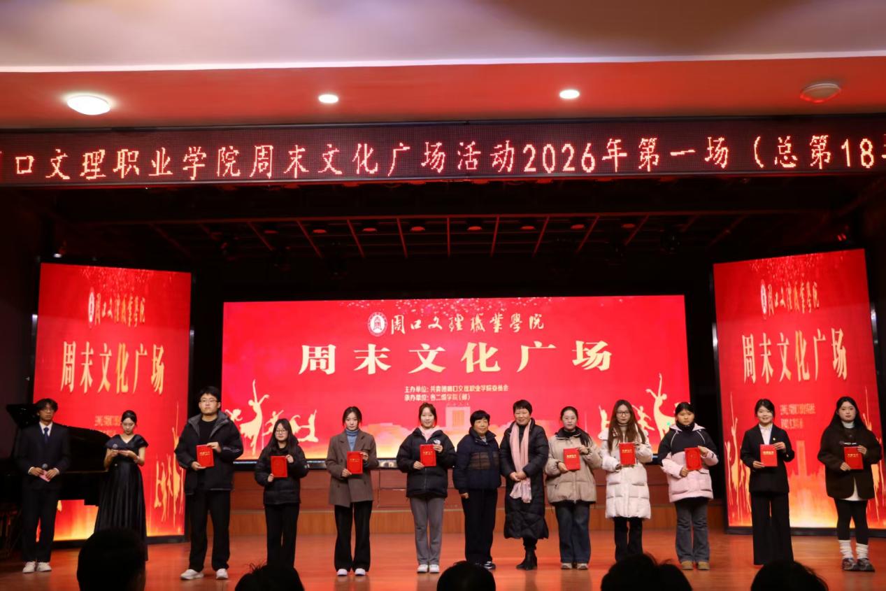 金马迎春添锦绣,青春逐梦谱新篇。2026年1月9日晚,周口文理职业学院“周末文化广场”2026年度首场文艺演出在学院演播厅精彩举行。本场演出以“辞旧迎新迎马年”为主题,融合文艺表演与表彰典礼,为师生呈现了一场视听与精神共鸣的文化盛宴。校党委书记宋晓东,副校长韩广飞、武金娟出席活动。