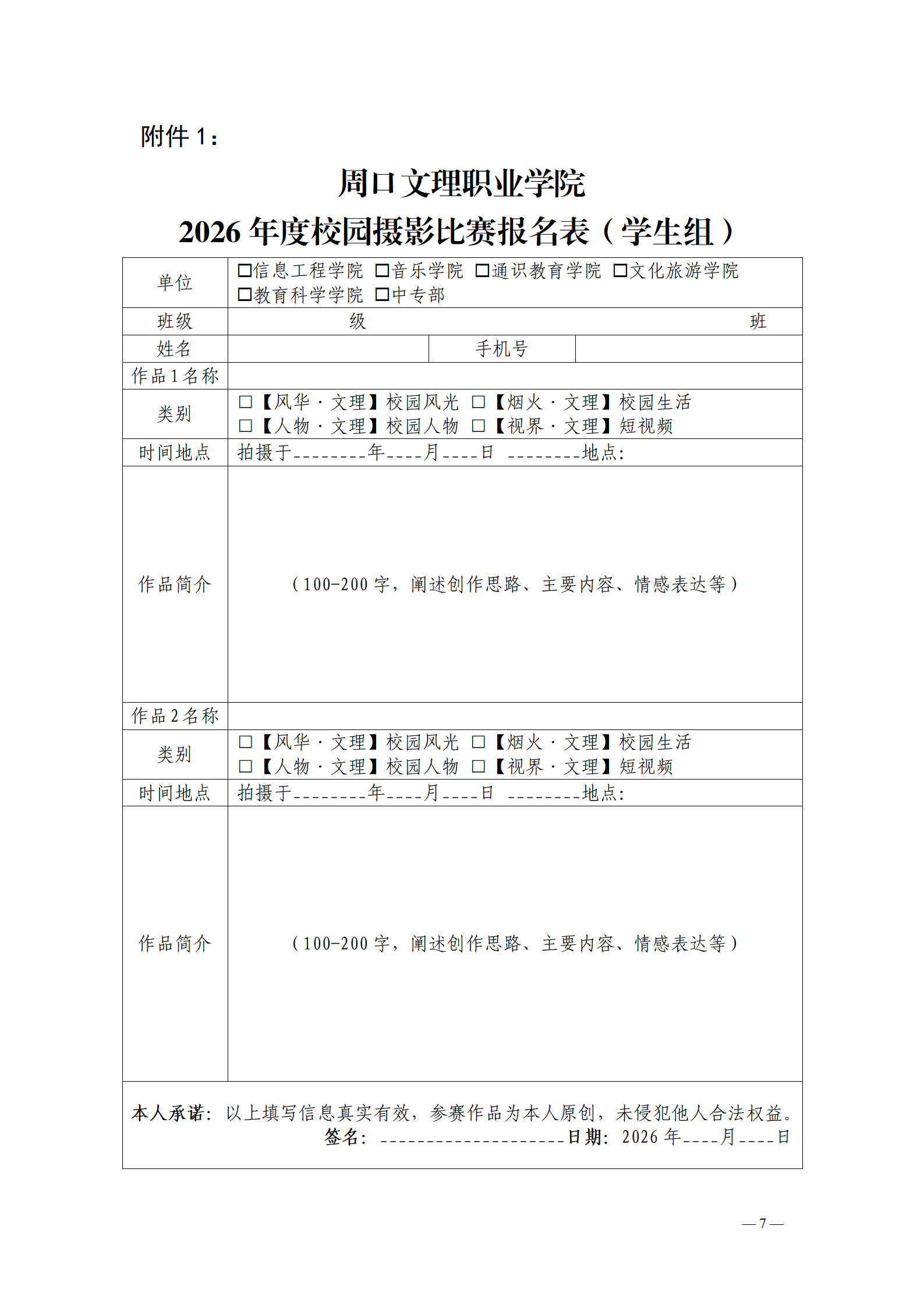1.周口文理职业学院2026年度校园摄影比赛报名表(学生组)