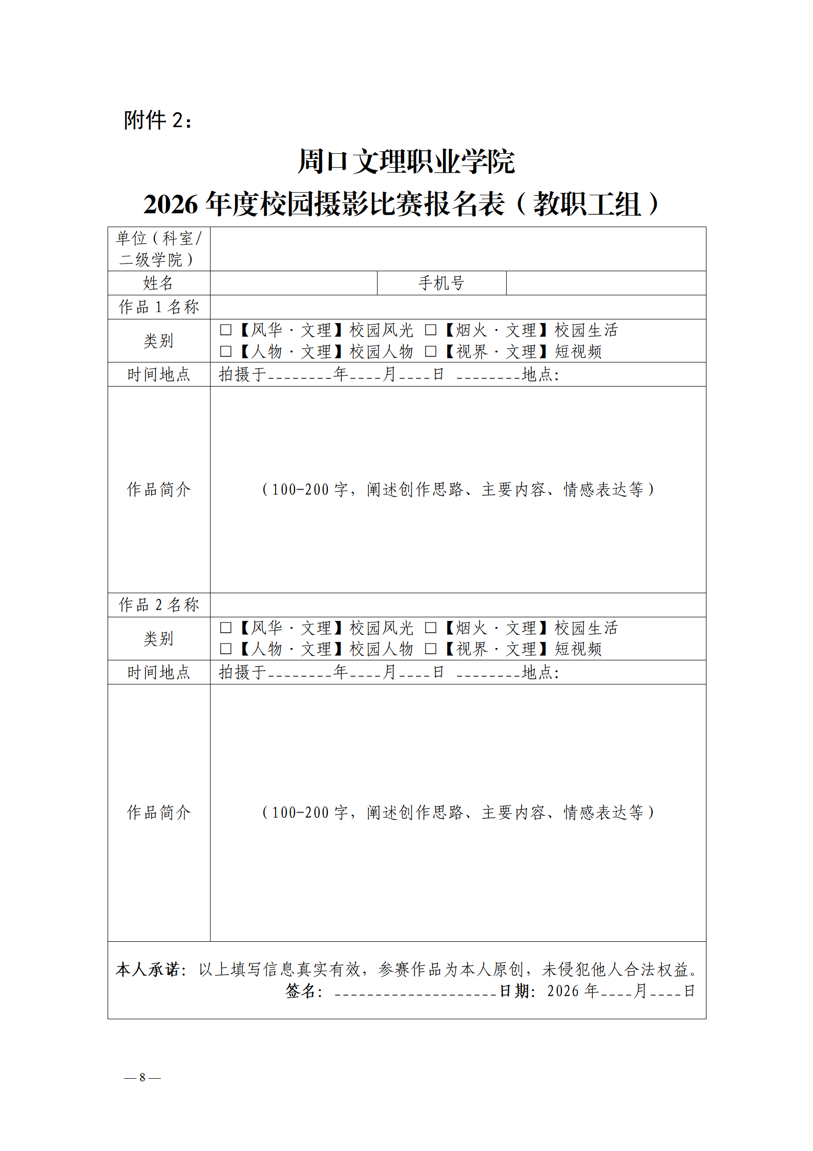 2.周口文理职业学院2026年度校园摄影比赛报名表(教职工组)